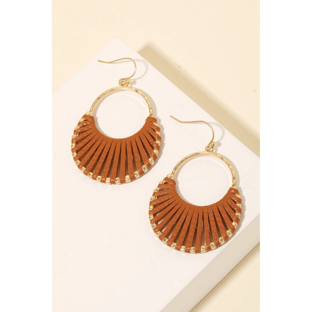 Perfect for any fashionista, this pair of dangle earrings feature a unique brown faux leather wrap, crescent hoop, dangle design. Add a dash of sophistication to your look with this versatile accessory, a must-have for any fashion forward style.
