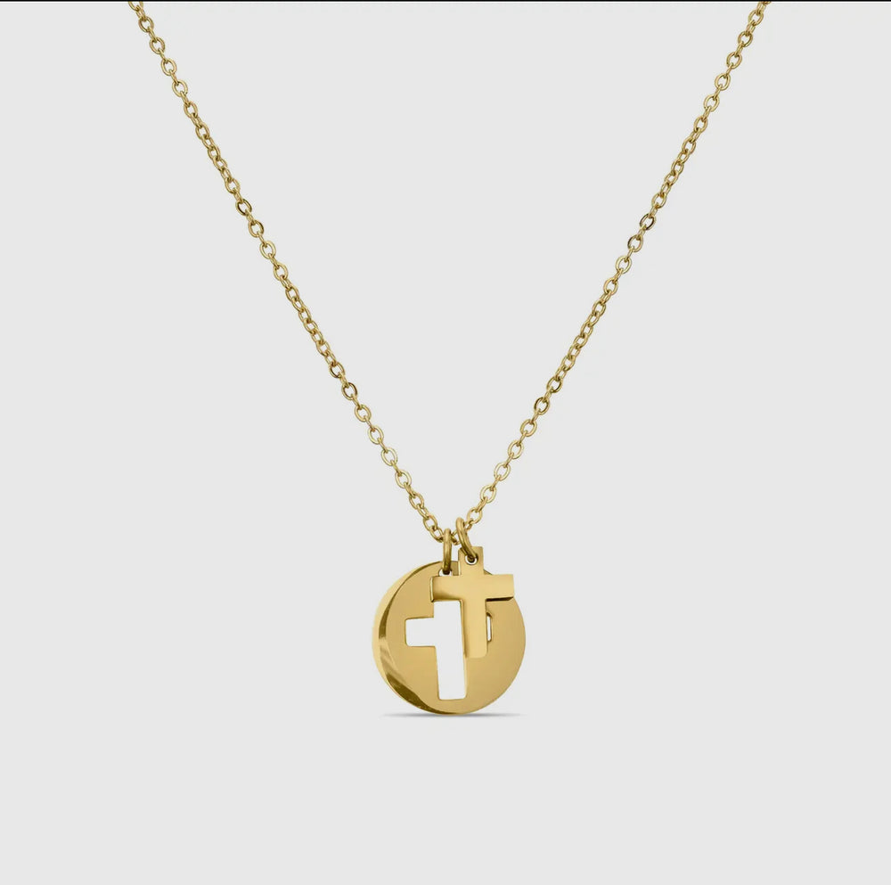 This beautiful hypoallergenic gold cross cutout necklace is the perfect blend of modern elegance and timeless faith. Featuring a sleek round pendant, with a minimalistic cross cut-out in the center. This piece is available in gold or silver, and is a very versatile item for your accessory collection.