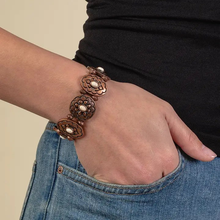 This ivory and copper squash blossom bracelet features beautiful mini ivory stones framed in a flower shape setting. Its western-inspired design is complemented by a stretch fit band, making it both stylish and easy to wear. Perfect for adding a touch of unique charm to your everyday look.
