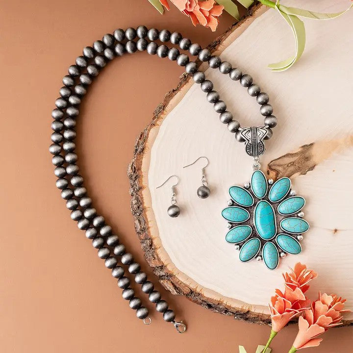 This squash blossom turquoise necklace showcases a 32-inch beaded chain paired with a bold 3-inch turquoise pendant, creating a distinctive and elegant look. This is perfect for adding a touch of southwestern charm to your wardrobe.