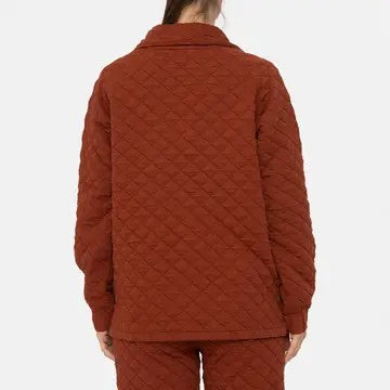 Indulge in comfort with this insulated quilted mahogany jersey. Soft, stretchy & warm, this oversized boyfriend-fit piece features raglan sleeves for extra comfort, soft jersey cuffs, a vented hem, kangaroo pocket, half zip front, and high neck -your perfect blend of style and coziness.