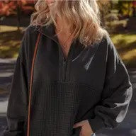 This cozy grey pullover sweatshirt will be a go-to for effortless style. With its relaxed fit and fun half-zip front, it’s easy to throw on and ready for anything. The waffle-knit fabric adds a delightful texture that keeps things interesting, while the patchwork design brings a playful twist. Perfectly flattering for all body shapes.