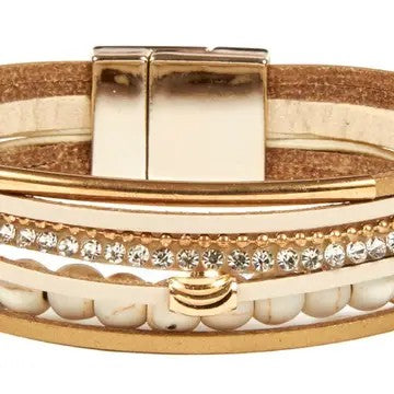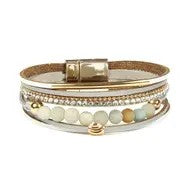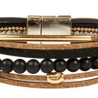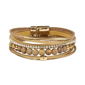 Discover understated luxury with this stone beads and gemstones bracelet. The magnetic snap closure combines practicality with elegance, offering seamless wearability. This beautiful bracelet is available in four distinguished palettes: striking black, warm light brown, gleaming gold, or silvery sophistication. Whether layered with complementary pieces or worn as a standalone accent, this versatile bracelet elevates any style.