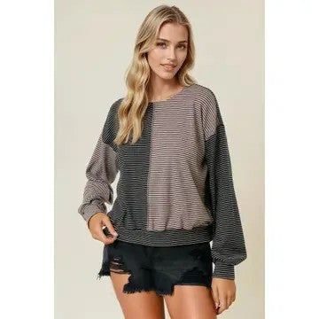 Embrace laid-back style with this drawstring black stripe top. This shirt features a two-tone stripe pattern with fun, contrasting directions. Its dropped shoulder seams create a relaxed, oversized vibe perfect for cozy days, while long sleeves with ribbed cuffs keep you comfy. It also features a round neck and back drawstring with keyhole detail for a customizable twist.