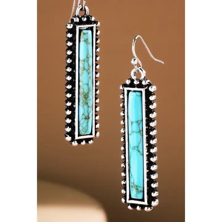 These beautiful bar drop earrings feature a genuine turquoise encased in a beaded edge frame. Crafted with quality nickel/lead compliant materials, these beautiful earrings make a striking statement piece. Perfect for layering or wearing solo, they bring timeless elegance to any outfit.