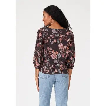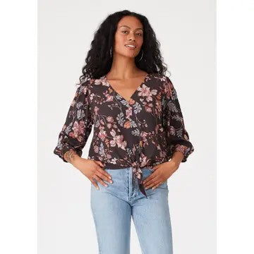 This lovely brown and dusty lilac floral blouse features a flattering V-neckline and relaxed fit, making it an easy choice for comfortable, casual wear. The 3/4 length sleeves with elastic cuffs and a charming tie-front detail add subtle style, perfect for cozy Fall days. Pair it with your favorite denim for an effortlessly put-together look.