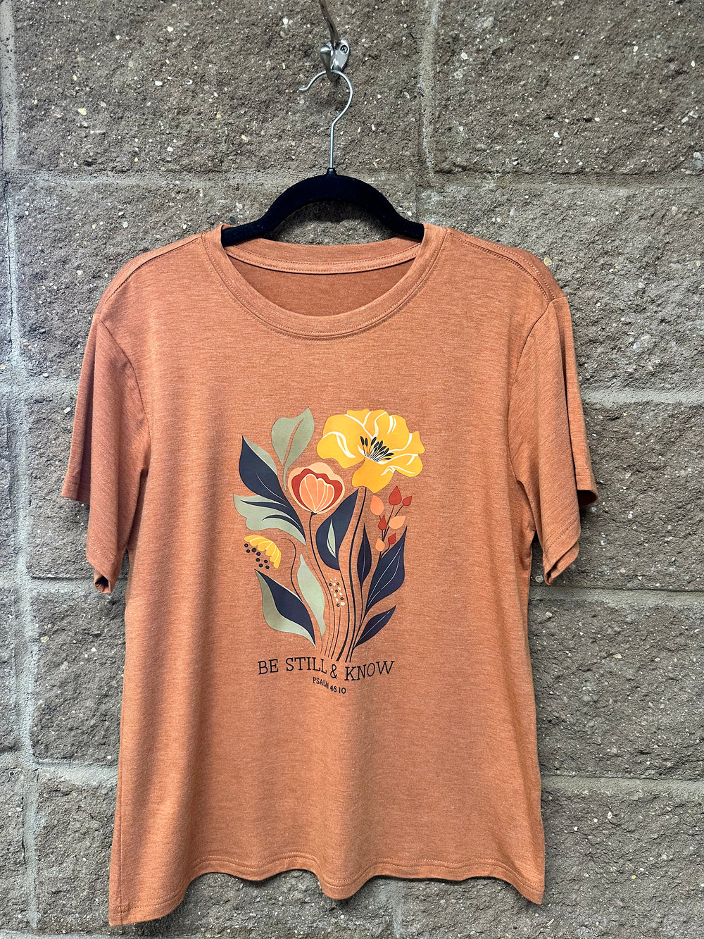 This T-shirt has a warm, earthy feel with a soft heathered rust or clay-orange color. It features a classic crew neckline, short sleeves, and a relaxed, comfortable fit that makes it perfect for everyday wear.