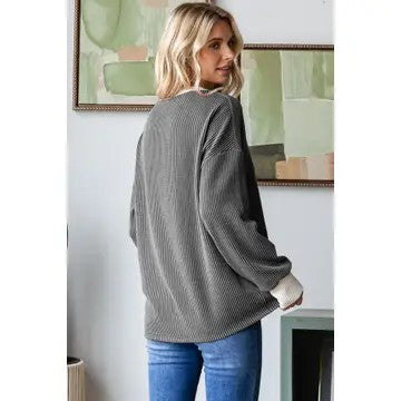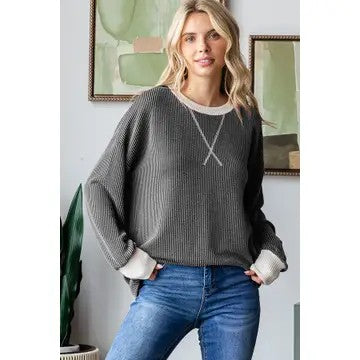 This dark grey ribbed top will keep you looking casually chic. The textured fabric adds dimension, and the drop shoulders and a relaxed fit keep things comfortable. The round neckline, long sleeves, and exposed stitches give it personality and edge. This top will pair with so many things in your closet—dress it down with sneakers or elevate it with tailored bottoms.