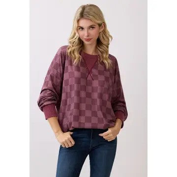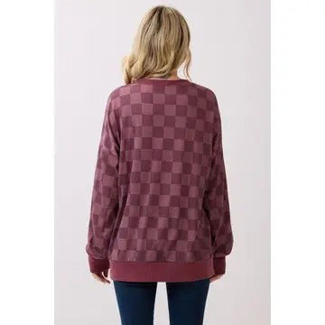 Step into comfort with this vintage burgundy checkered pullover. The relaxed fit and drop shoulders offer all day comfort, while solid rib trim at the neckline, cuffs, and hem provides refined structure. Exposed stitching adds character. Whether you're dressing down for the weekend or layering for cooler days, this versatile piece feels as good as it looks.