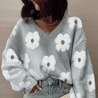 This cute grey sweater features a cheerful flower pattern that adds a fun pop to any outfit, and a ribbed v-neckline, while the drop shoulders and baggy silhouette will give you all-day comfort. This top is perfect for brightening up chilly days with a casual, cute and carefree vibe.