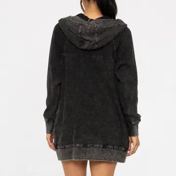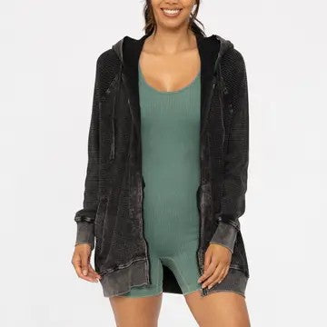 A great choice for layering season, this full zip front black hoodie jacket is an essential addition. This hoodie features a mineral washed, waffle knit fabric, an oversized fit, a woven trim, an adjustable drawcord at the hood, and a ribbed hem & sleeve cuffs. This is a great layering piece with jeans or shorts.