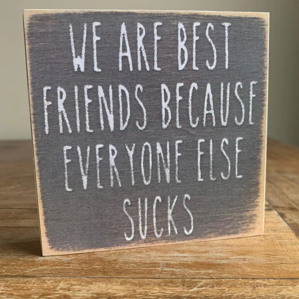 Spice up your home with this 4 x 4 wooden block sign! With a dark grey stained background and the message "We are best friends because everyone else sucks", this fun and playful conversation piece is sure to add some excitement to your space. Have some fun and make a statement!