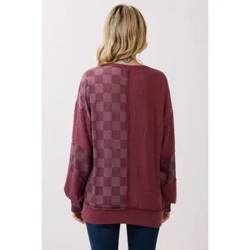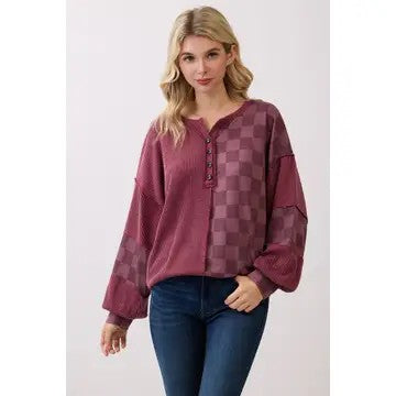 Effortlessly cool meets cozy charm with this burgundy Henley patchwork pullover! Mixing burgundy tones and checkered prints, it makes getting dressed feel like fun. Button-front style, drop shoulders, and a relaxed fit create that perfectly laid-back vibe, while exposed stitching and a banded hem add personality and texture. This versatile piece is ready for whatever your day brings.