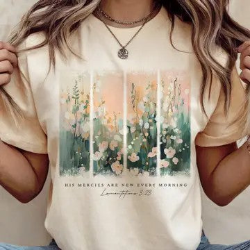 This short sleeve "His Mercies Are New Every Morning" graphic tee offers a gentle reminder of hope and renewal. Soft floral watercolor shades on a cream background create a calming look, while the classic crew neckline and relaxed fit ensure comfort throughout your day. With a faith-based message, this tee supports your spirit and style in perfect harmony.