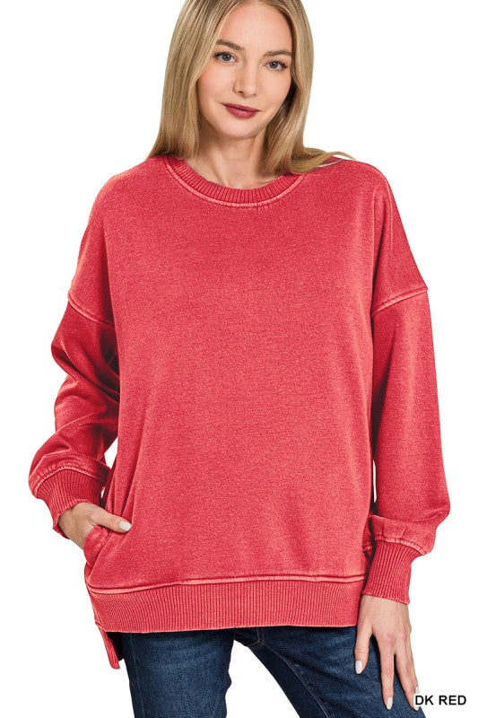 Made with soft pigment dyed fleece, this relaxed fitting silhouette pullover sweatshirt offers a cozy and stylish addition to your wardrobe. Featuring a hi-low ribbed hemline, round ribbed neckline, long ribbed sleeves, and side pockets, this dark red-colored top provides both comfort and functionality. Perfect for any casual occasion.