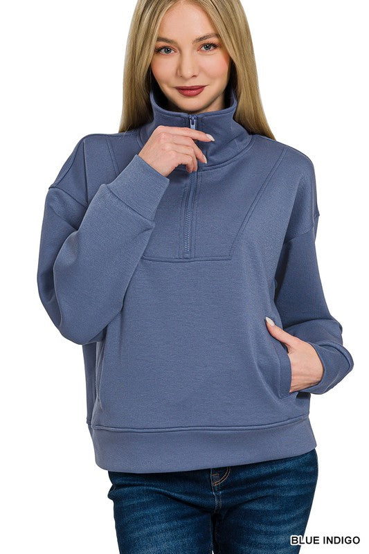 This relaxed-fit blue indigo scuba pullover top combines comfort and casual style effortlessly. Featuring a mock neckline and half-zip front, it offers adjustable coverage and easy wear. Long sleeves with drop shoulders add a laid-back vibe, while side pockets provide convenient storage. Perfect for your everyday casual look.