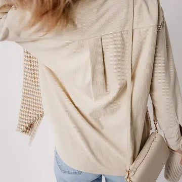 Step up your style with this super cute brown and cream shacket! Featuring flap chest pockets, this shirt jacket blends classic houndstooth with cozy corduroy for a look that’s both timeless and fun. Perfect for layering, it’s the playful twist your outerwear collection has been waiting for.