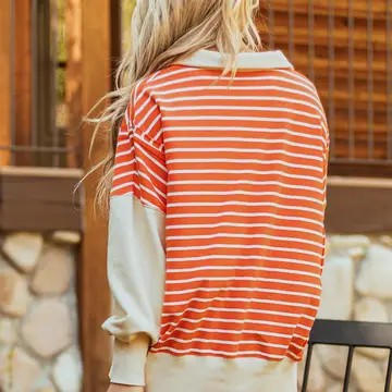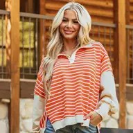 Get into fun fashion with this orange stripe sweatshirt. Featuring a laid-back drop shoulder design and a fun turn-down collar, this top offers casual comfort with a touch of sophistication, plus it features a side slit hem and a very relaxed fitting silhouette. The stripe pattern keeps your look fresh and on-trend—perfect for those easygoing days when style and comfort