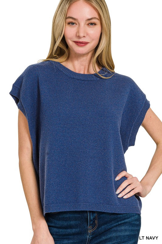 This versatile and cute light navy oversized sweater vest features short sleeves and ribbed detailing on the round neckline, sleeves, and hem. Its relaxed, loose fit offers comfortable layering, making it an ideal choice to pair with skinny jeans or skirts for a casual, stylish look. Perfect for adding a cozy, yet chic, touch to your wardrobe.