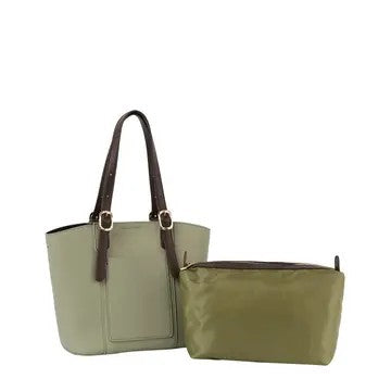Carry your essentials in style with this versatile faux light sage vegan leather bucket tote. The magnetic snap closure keeps your belongings secure, while the detachable long strap offers flexible carrying options—wear it as a shoulder bag or remove the strap for handheld convenience. This 2-piece set includes a bonus nylon zipper pouch, perfect for organizing smaller items or taking on the go. SIZE: Depth: 9" Height: 4" Length: 12"