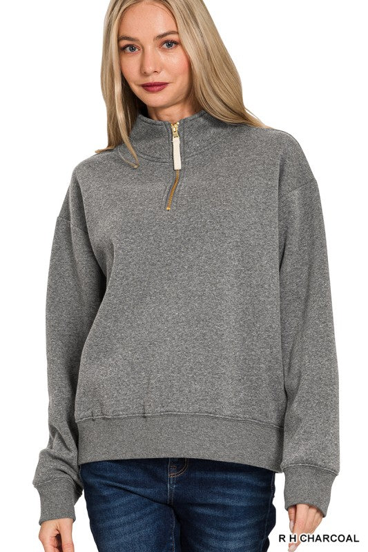 This heather charcoal fleece sweatshirt offers cozy warmth with its soft fabric and loose-fitting silhouette. Featuring a half-zip front and mock neckline, it’s easy to layer and adjust for comfort. The drop shoulder design and long cuff sleeves add a relaxed feel, making it a perfect casual choice. Pair it with jeans for effortless everyday style and all-day comfort.