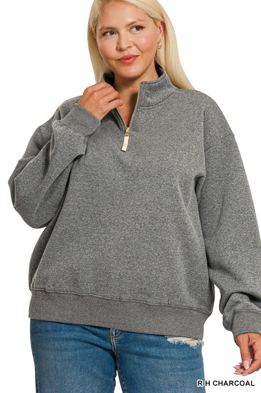 This plus size heather charcoal fleece sweatshirt offers cozy warmth with its soft fabric and loose-fitting silhouette. Featuring a half-zip front and mock neckline, it’s easy to layer and adjust for comfort. The drop shoulder design and long cuff sleeves add a relaxed feel, making it a perfect casual choice. Pair it with jeans for effortless everyday style and all-day comfort.