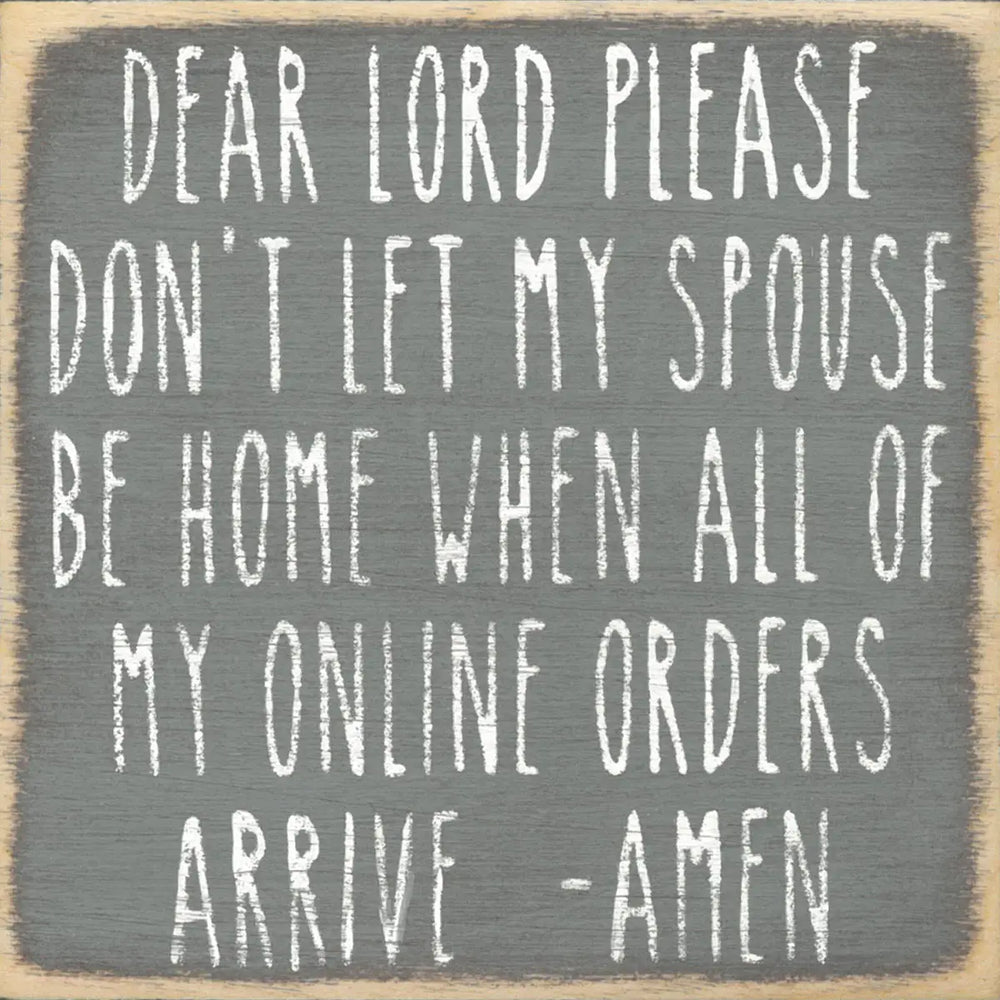 Spice up your home with this 4 x 4 wooden block sign! With a dark grey stained background and the message "Dear Lord, please don't let my spouse be home when all of my online orders arrive - Amen", this fun and quirky conversation piece is sure to add some excitement to your space. Have some fun and make a statement!