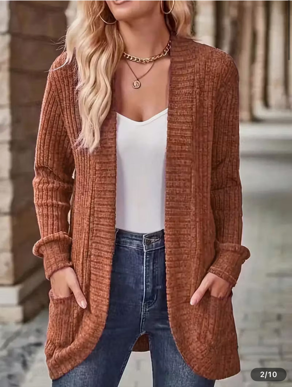 Made from soft, warm fabric, this cardigan in a beautiful orange color is the perfect layering piece. Its open front design and convenient side pockets make it both functional and chic. Plus, the ribbed edges add a touch of subtle texture.