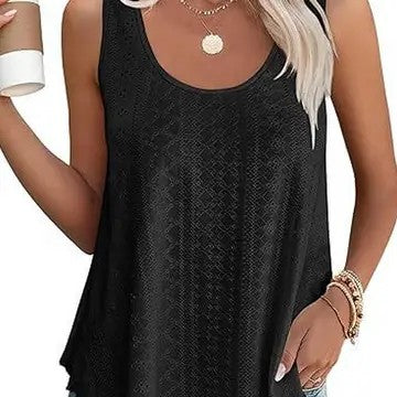 This soft knit tank in black boasts beautiful lace details and a flattering, loose silhouette. With a round neckline and sleeveless design, this tank top is perfect for layering under a blazer or kimono, or wearing alone with shorts or jeans. A versatile addition to any wardrobe!