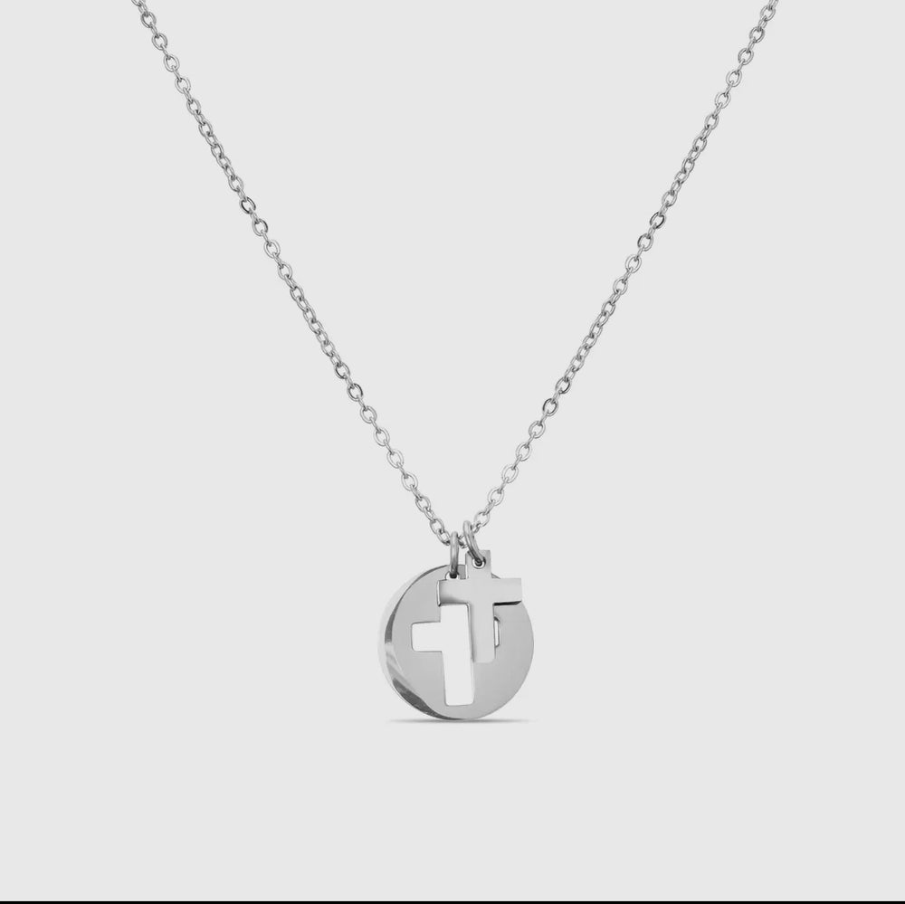 This beautiful hypoallergenic silver cross cutout necklace is the perfect blend of modern elegance and timeless faith. Featuring a sleek round pendant, with a minimalistic cross cut-out in the center. This piece is available in gold or silver, and is a very versatile item for your accessory collection.
