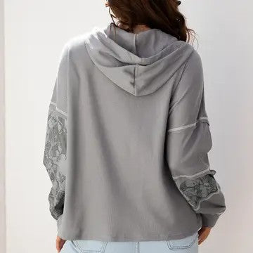 This plus size grey hoodie top combines warmth with style. Its waffle knit texture provides texture. This pullover hoodie also features a partial button front, drawstring, long color block sleeves and a relaxed fit. Enjoy wearing this for casual, cooler days, balancing practicality with relaxed fashion.