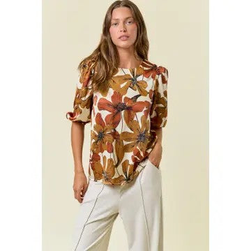 This charming rust floral blouse features a classic round neckline paired with fun puff 3/4 sleeves that bring a flirty, feminine vibe. The back keyhole with a cute button closure makes it easy to slip on while adding a sweet detail. With its relaxed fit and lively floral print, it’s perfect for mixing and matching—from casual outings to dressy moments that need a splash of style.