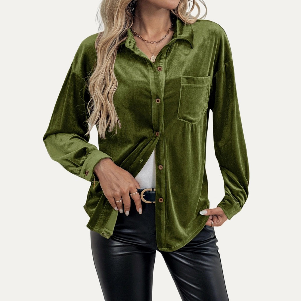 This beautiful lightweight olive velvet top features a soft texture that feels gentle against the skin. Designed with a collared neckline and long sleeves, this shirt offers a relaxed fit with a functional button front and a convenient pocket for everyday ease. Unlined for breathability, this piece combines comfort and style effortlessly.