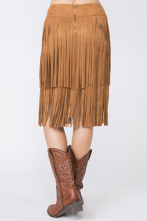 Elevate your wardrobe with this adorable camel suede skirt. The layered fringe adds a playful touch, while the back zip closure ensures a perfect fit. With a knee length design, this skirt is sure to become a staple piece in your closet. Pair with boots and your favorite top, and don't miss out on this must-have piece!