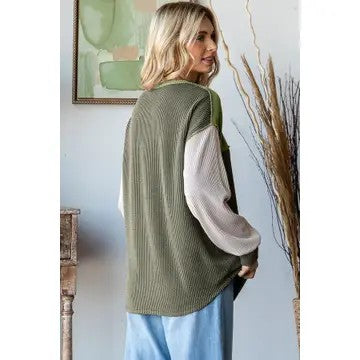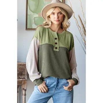 Embrace effortless style with this plus size olive color block long sleeve top. Designed for comfort, it features a relaxed fit with long sleeves, a round neck, and a button-front detail for versatility. The exposed stitch seams and drop shoulder style add subtle character, while the curved hem delivers a flattering silhouette.