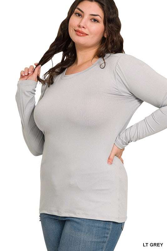 This brushed light grey microfiber, long sleeve, round neck tee is so buttery soft, warm and perfect for layering! Comfy is what this shirt is and can be used in sooo many ways including sporting events to add a layer of warmth! Pair with your favorite jeans and boots or sneakers and add a long necklace to complete your look!