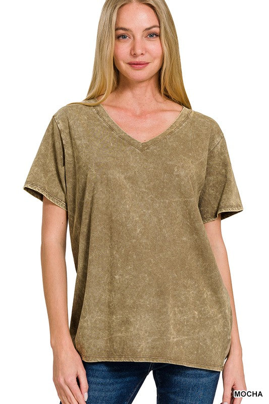 Experience ultimate comfort with this plus size, mocha v-neckline top. Made with a beautiful camel washed fabric, this top features a v-neckline and short sleeves for a classic look. The loose fitting style and straight hem ensure a comfortable and flattering fit, perfect for any occasion. With a hip length design, you'll feel confident and stylish all day long.