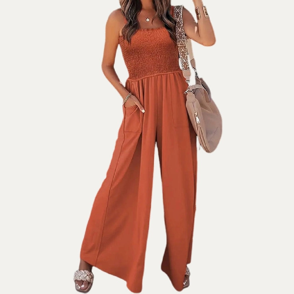 This brick red jumpsuit offers a lightweight poly fabric which makes it comfortable to wear. Featuring a square neckline and tank straps, its smocked, sleeveless bodice provides a flattering fit. Practical patch pockets add convenience, while the high waist and wide-leg pants create a stylish, elongating silhouette. This piece blends comfort and effortless style.