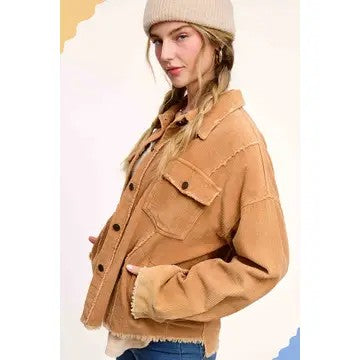 This camel jacket is a perfect layering piece that features a vintage wash-perfectly highlighted corduroy fabric, with a raw hem detail, a collar neckline and classic button front opening with chest pockets and a relaxed oversized silhouette. Pair over your favorite top and jeans.
