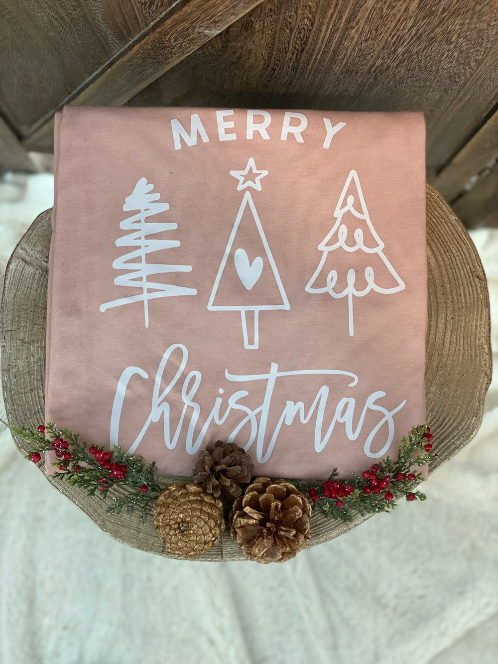 Here is another adorable Christmas graphic t-shirt for the holiday season. The design graphic says Merry Christmas and has a super cute doodle trees image, all on a beautiful heather peach background. This tee has a classic crew neckline short sleeves and a relaxed fit. It offers an effortless fit with jeans and your favorite Christmas socks!