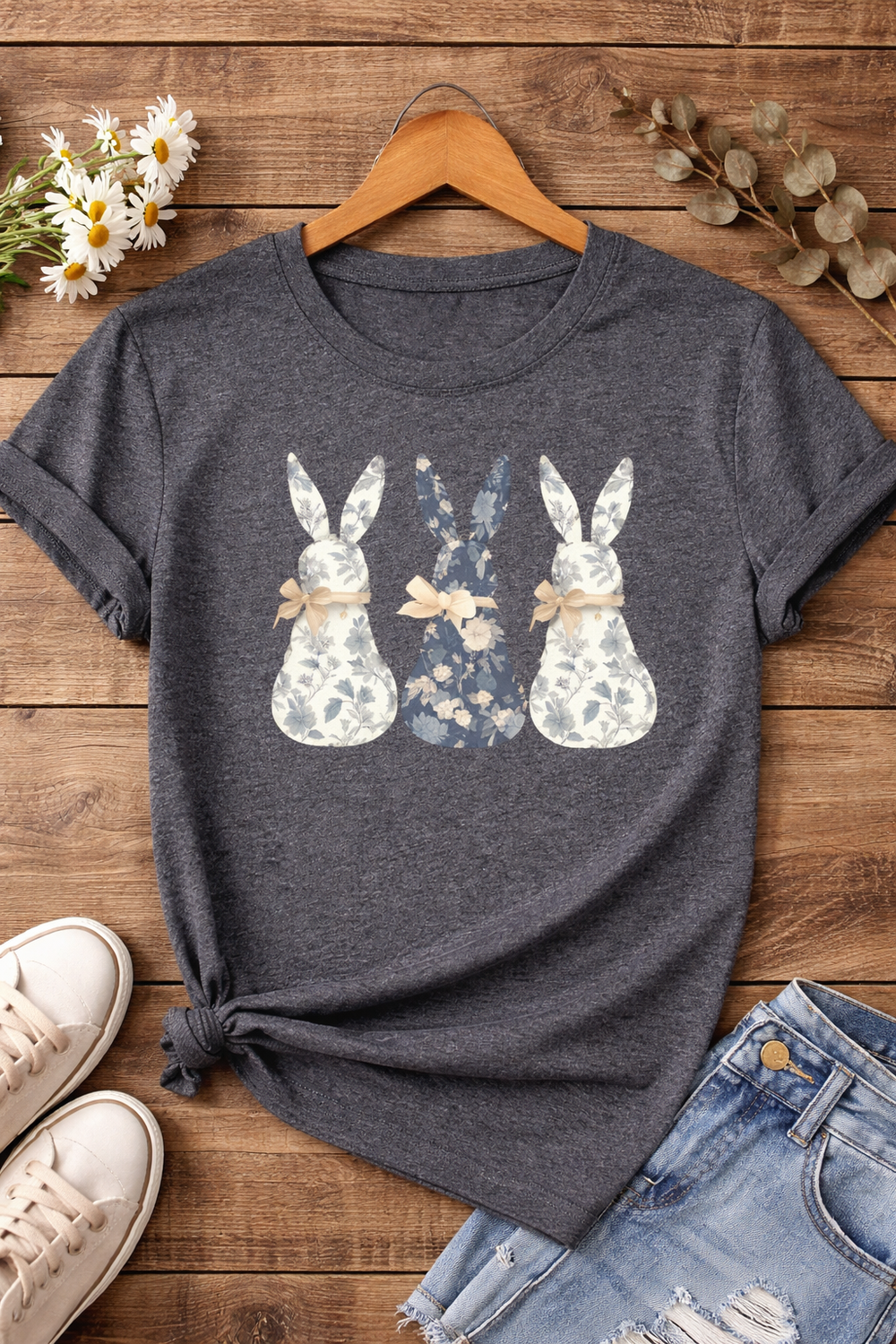 The front design showcases three bunny silhouettes centered across the chest. Each bunny has a vintage floral pattern—two in soft white and gray tones on the sides and one in a muted navy blue in the middle. All three bunnies are accented with delicate beige bows, adding a sweet, rustic touch.