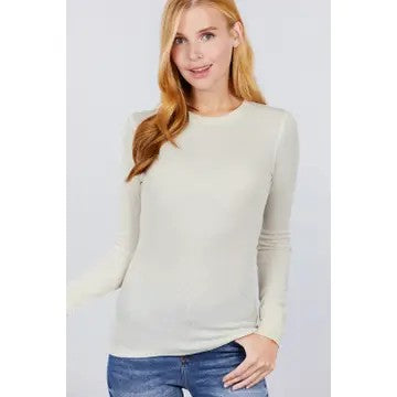 Elevate your layering game with this solid ivory long sleeve knit top. Featuring a fitted silhouette and a classic round neckline, this soft knit top provides a flattering foundation that pairs effortlessly under your favorite shackets or jackets. Its versatile olive shade and sleek design make it an essential layering piece for cooler weather, keeping you comfortably stylish all season long.