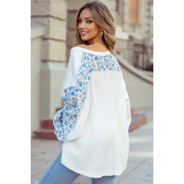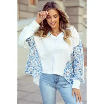 This relaxed fitting white blouse features beautiful blue floral batwing long sleeves, a ribbed cuff, and a high low hem. This top also features a v-neckline and relaxed fit for a confident style. This piece offers a touch of elegance to a casual design. Perfect for a stylish and effortless look.