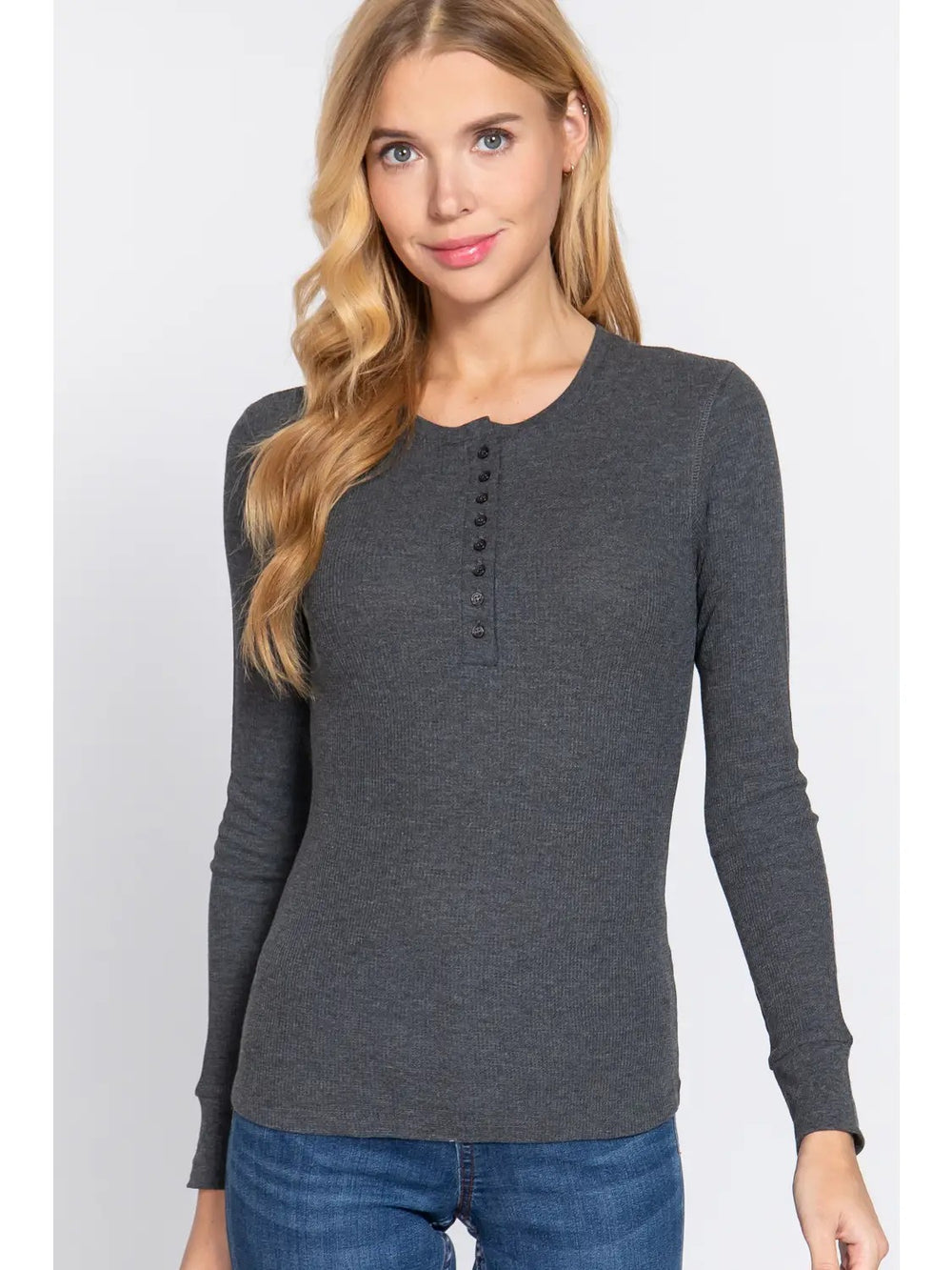 This charcoal grey long sleeve Henley top is designed with comfort in mind. The partial button front and round neckline provide a relaxed fit that's easy to wear all day. Made from soft, lightweight fabric, it is perfect for layering through all seasons. Whether you're dressing up or keeping it casual, this top offers cozy versatility to support your everyday style.
