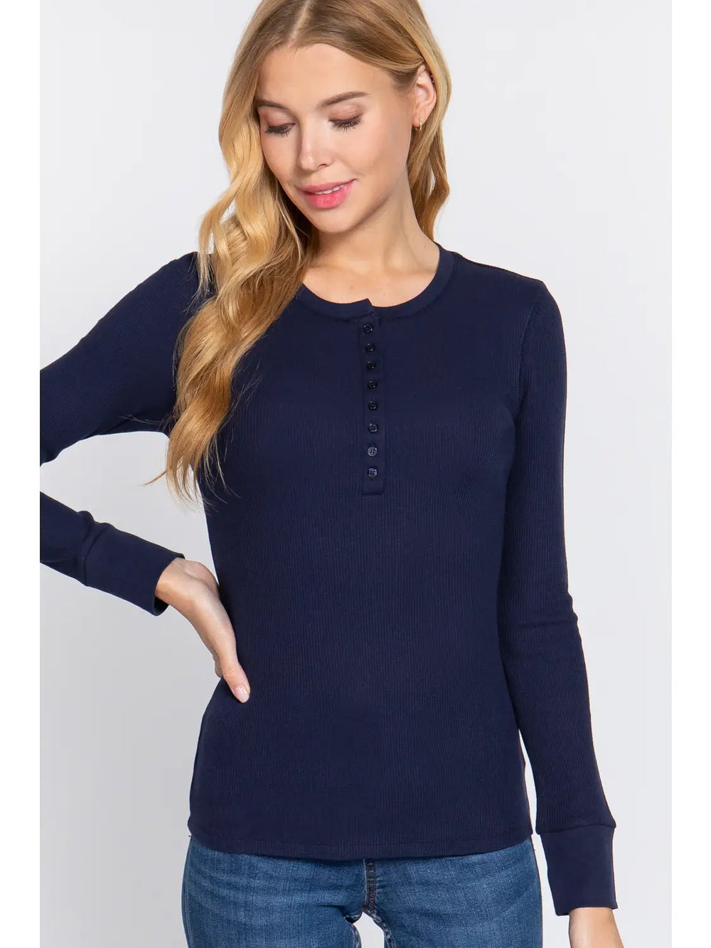 This navy long sleeve Henley top is designed with comfort in mind. The partial button front and round neckline provide a relaxed fit that's easy to wear all day. Made from soft, lightweight fabric, it is perfect for layering through all seasons. Whether you're dressing up or keeping it casual, this top offers cozy versatility to support your everyday style.
