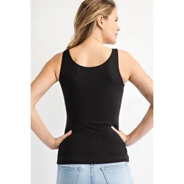 Slip into style with this fitted black tank top, made from buttery soft fabric that feels as good as it looks. The wide straps provide comfortable support, while the classic round neckline keeps things timeless and versatile. Whether worn solo or layered under your favorite button-down shirt, this essential piece adapts to your wardrobe with ease.