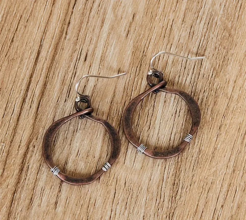 These bronze hoop earrings feature a delicate silver wire wrap accent, adding subtle contrast and charm. The lightweight design ensures comfortable all-day wear, while the fishhook-style backs provide easy and secure fastening. Ideal for enhancing everyday looks with a touch of handcrafted elegance.