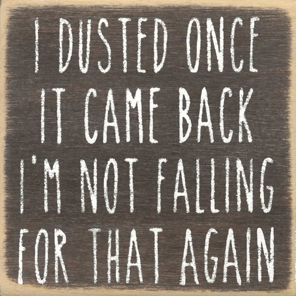 Spice up your home with this 4 x 4 wooden block sign! With a dark grey stained background and the message "I dusted once, it came back. I'm not falling for that again", this fun and quirky conversation piece is sure to add some excitement to your space. Have some fun and make a statement!